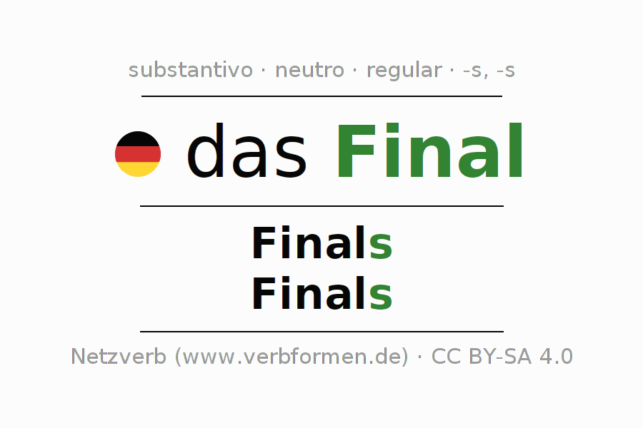 A declinação do substantivo Final (finale) está no genitivo singular Finals e no nominativo plural Finals . O substantivo forte Final é declinado com a terminação s/s. O gênero gramatical de Final é neutro e o artigo definido é "das". O substantivo também pode ser usado com outros géneros e outros artigos. Não se pode somente declinar o substantivo Final mas sim todos os substantivos em alemão. Comentários ☆