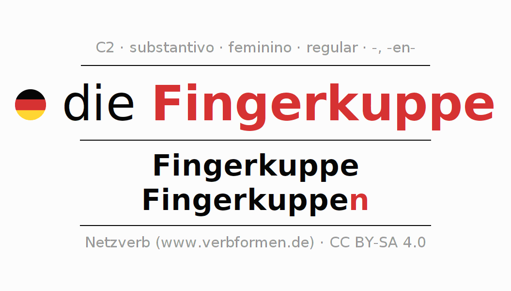 Declinação de Fingerkuppe é apresentada em uma tabela com todas as formas no singular e no plural (plural) e em todos os quatro casos: nominativo (1º caso), genitivo (2º caso), dativo (3º caso) e acusativo (4º caso) . Especialmente para os alunos de alemão, a correta declinação da palavra Fingerkuppe é fundamental.