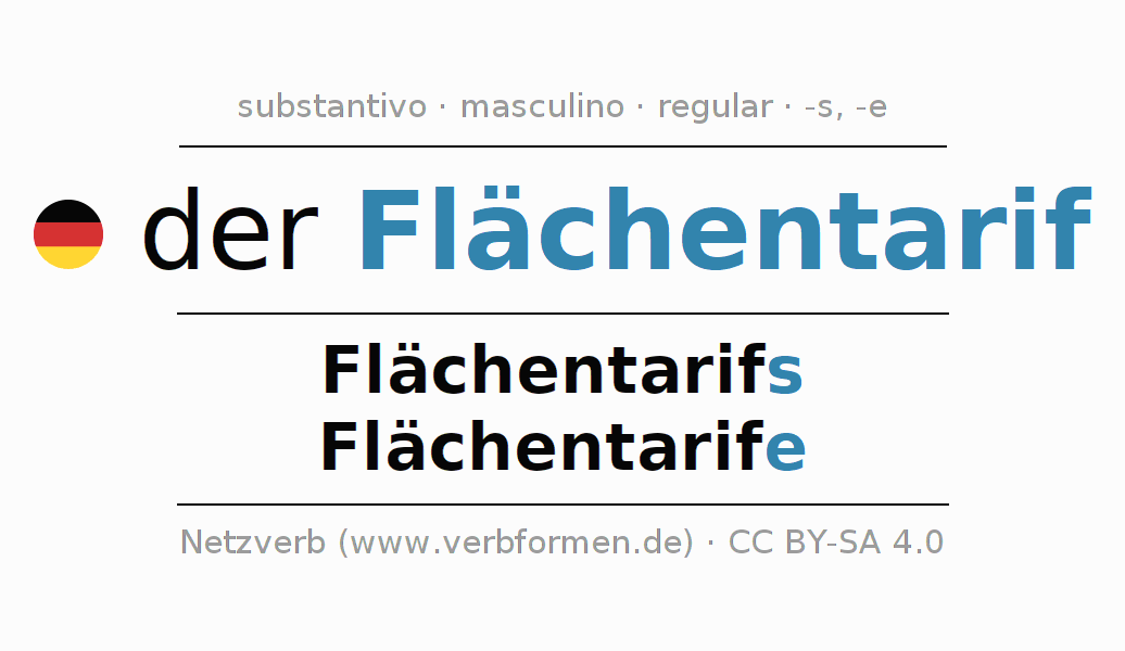 A declinação do substantivo Flächentarif (convenção coletiva regional) está no genitivo singular Flächentarifs e no nominativo plural Flächentarife . O substantivo forte Flächentarif é declinado com a terminação s/e. O gênero gramatical de Flächentarif é masculino e o artigo definido é 'der'. Não se pode somente declinar o substantivo Flächentarif mas sim todos os substantivos em alemão. Comentários ☆