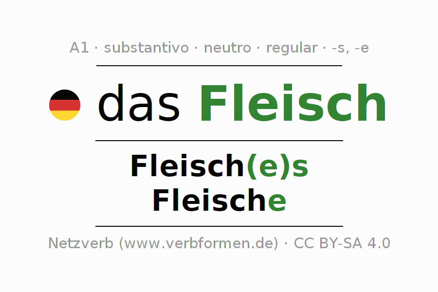 Declinação de Fleisch é apresentada em uma tabela com todas as formas no singular e no plural (plural) e em todos os quatro casos: nominativo (1º caso), genitivo (2º caso), dativo (3º caso) e acusativo (4º caso) . Especialmente para os alunos de alemão, a correta declinação da palavra Fleisch é fundamental.