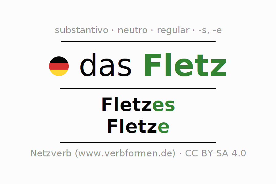 A declinação do substantivo Fletz está no genitivo singular Fletzes e no nominativo plural Fletze . O substantivo forte Fletz é declinado com a terminação es/e. O gênero gramatical de Fletz é neutro e o artigo definido é "das". O substantivo também pode ser usado com outros géneros e outros artigos. Não se pode somente declinar o substantivo Fletz mas sim todos os substantivos em alemão. Comentários ☆