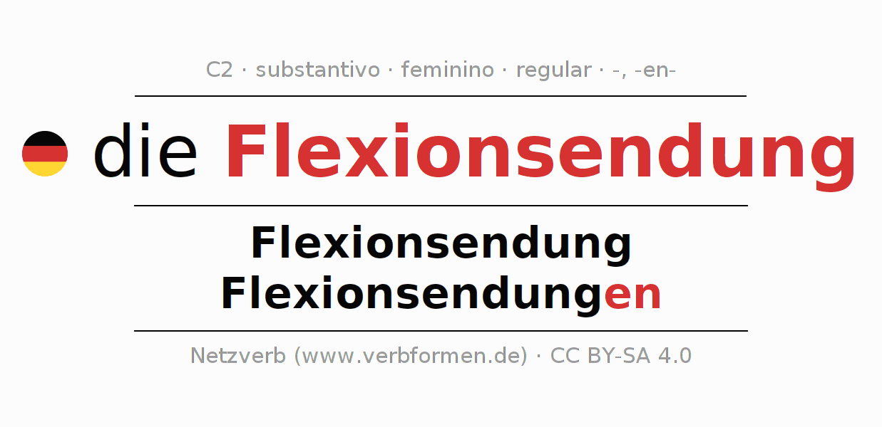 Declinação de Flexionsendung é apresentada em uma tabela com todas as formas no singular e no plural (plural) e em todos os quatro casos: nominativo (1º caso), genitivo (2º caso), dativo (3º caso) e acusativo (4º caso) . Especialmente para os alunos de alemão, a correta declinação da palavra Flexionsendung é fundamental.