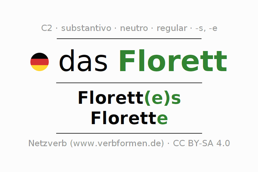 Declinação de Florett é apresentada em uma tabela com todas as formas no singular e no plural (plural) e em todos os quatro casos: nominativo (1º caso), genitivo (2º caso), dativo (3º caso) e acusativo (4º caso) . Especialmente para os alunos de alemão, a correta declinação da palavra Florett é fundamental.