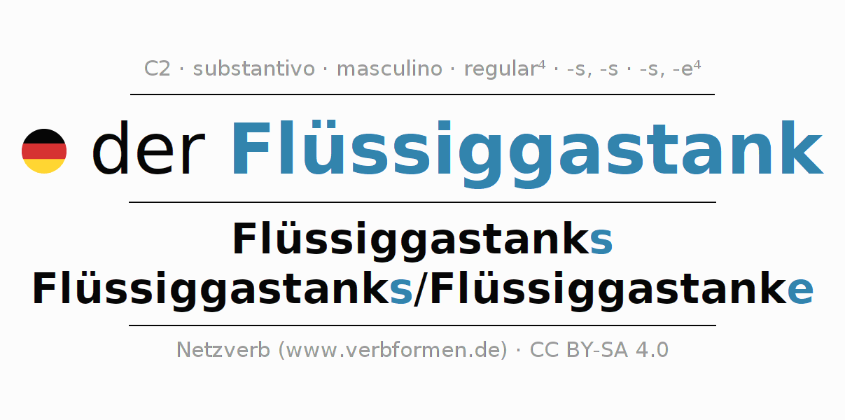 - Singular: der Flüssiggastank, des Flüssiggastanks, dem Flüssiggastank, den Flüssiggastank