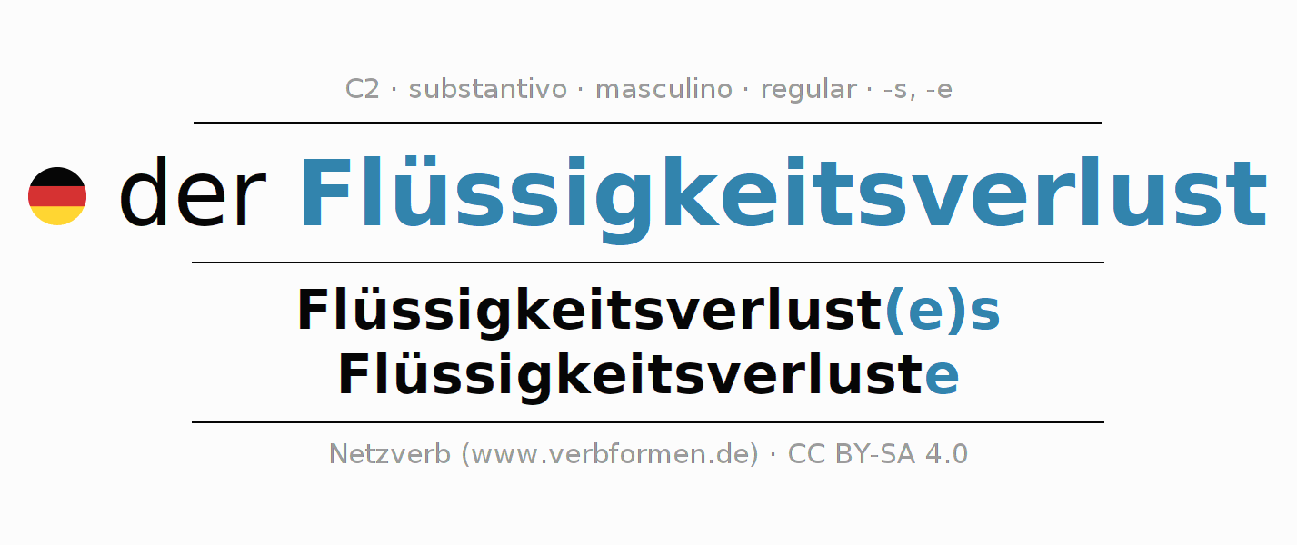 A declinação do substantivo Flüssigkeitsverlust (perda de líquido) está no genitivo singular Flüssigkeitsverlust(e)s e no nominativo plural Flüssigkeitsverluste . O substantivo forte Flüssigkeitsverlust é declinado com a terminação es/e. O gênero gramatical de Flüssigkeitsverlust é masculino e o artigo definido é 'der'. Não se pode somente declinar o substantivo Flüssigkeitsverlust mas sim todos os substantivos em alemão. O substantivo faz parte do vocabulário referente ao Certificado em Alemão do Nível C2. Comentários ☆