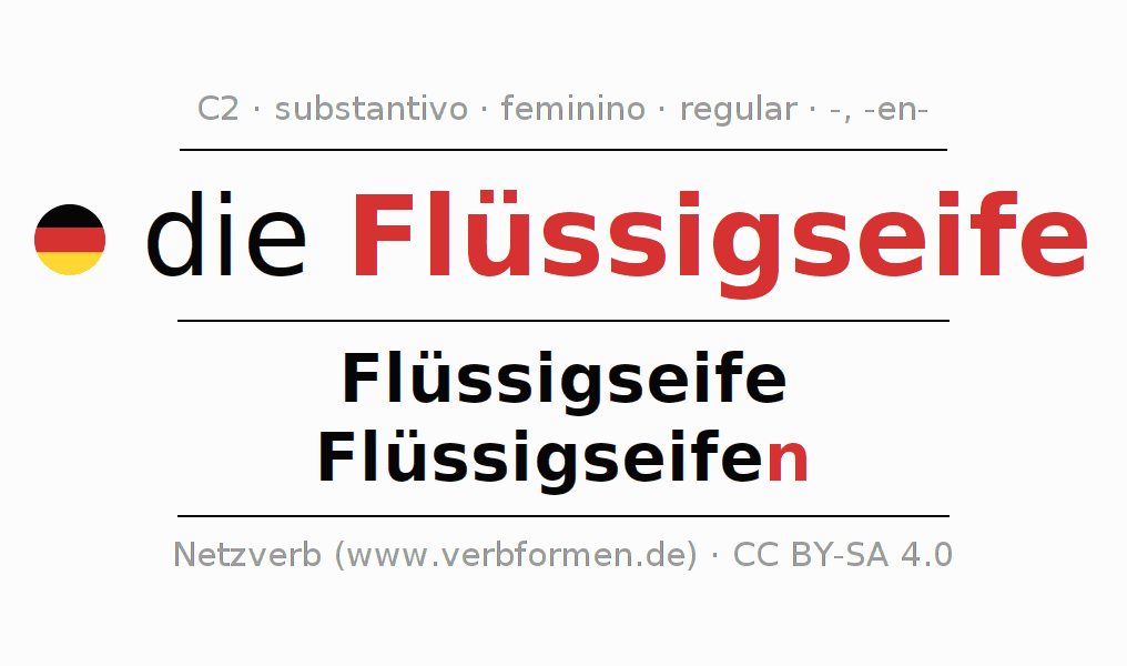 - Singular: die Flüssigseife, der Flüssigseife, der Flüssigseife, die Flüssigseife