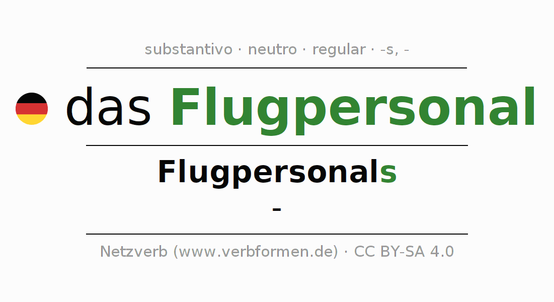A declinação do substantivo Flugpersonal (equipe de voo, tripulação) está no genitivo singular Flugpersonals e no nominativo plural - . O substantivo forte Flugpersonal é declinado com a terminação s/-. Não há formas no plural. O gênero gramatical de Flugpersonal é neutro e o artigo definido é "das". Não se pode somente declinar o substantivo Flugpersonal mas sim todos os substantivos em alemão. Comentários ☆