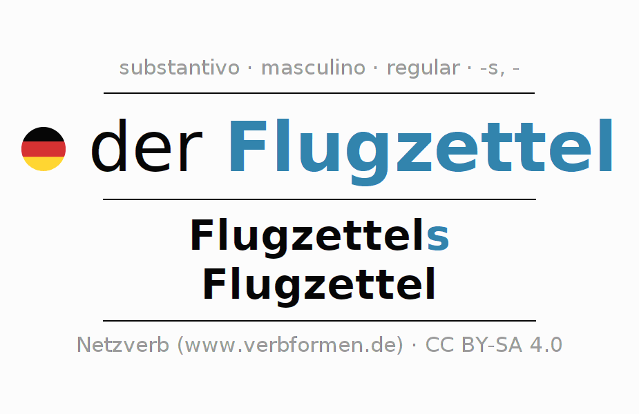 A declinação do substantivo Flugzettel (panfleto, folheto) está no genitivo singular Flugzettels e no nominativo plural Flugzettel . O substantivo forte Flugzettel é declinado com a terminação s/-. O gênero gramatical de Flugzettel é masculino e o artigo definido é 'der'. Não se pode somente declinar o substantivo Flugzettel mas sim todos os substantivos em alemão. Comentários ☆