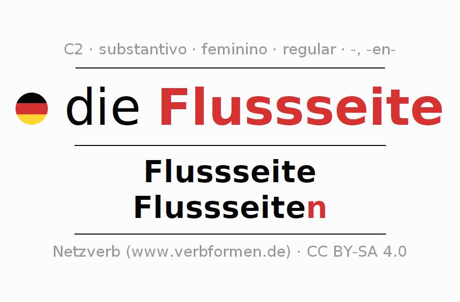 Declinação de Flussseite é apresentada em uma tabela com todas as formas no singular e no plural (plural) e em todos os quatro casos: nominativo (1º caso), genitivo (2º caso), dativo (3º caso) e acusativo (4º caso) . Especialmente para os alunos de alemão, a correta declinação da palavra Flussseite é fundamental.