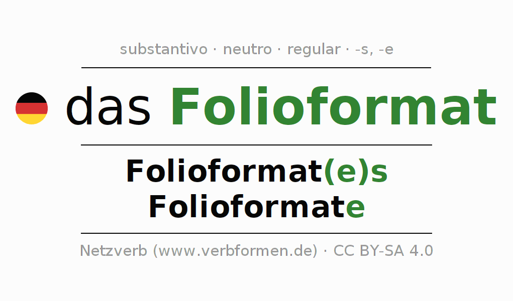 A declinação do substantivo Folioformat (formato fólio) está no genitivo singular Folioformat(e)s e no nominativo plural Folioformate . O substantivo forte Folioformat é declinado com a terminação es/e. O gênero gramatical de Folioformat é neutro e o artigo definido é "das". Não se pode somente declinar o substantivo Folioformat mas sim todos os substantivos em alemão. Comentários ☆