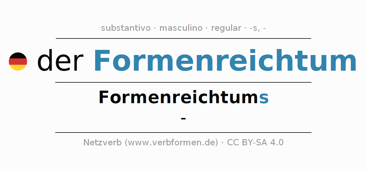 A declinação do substantivo Formenreichtum (riqueza de formas) está no genitivo singular Formenreichtums e no nominativo plural - . O substantivo forte Formenreichtum é declinado com a terminação s/-. Não há formas no plural. O gênero gramatical de Formenreichtum é masculino e o artigo definido é 'der'. Não se pode somente declinar o substantivo Formenreichtum mas sim todos os substantivos em alemão. Comentários ☆