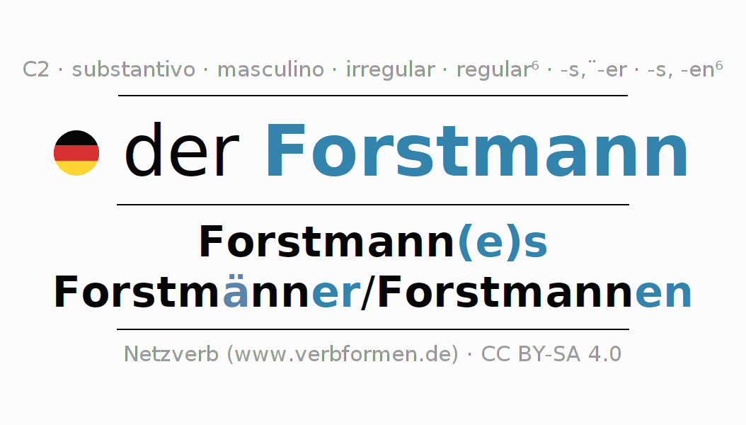 Declinação de Forstmann é apresentada em uma tabela com todas as formas no singular e no plural (plural) e em todos os quatro casos: nominativo (1º caso), genitivo (2º caso), dativo (3º caso) e acusativo (4º caso) . Especialmente para os alunos de alemão, a correta declinação da palavra Forstmann é fundamental.