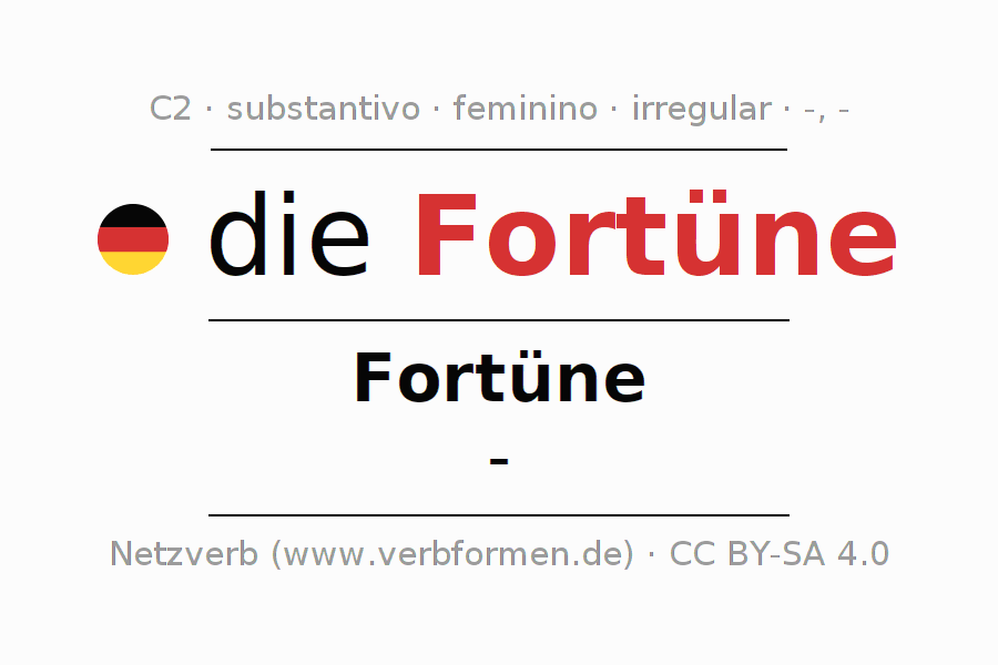 Declinação de Fortüne é apresentada em uma tabela com todas as formas no singular e no plural (plural) e em todos os quatro casos: nominativo (1º caso), genitivo (2º caso), dativo (3º caso) e acusativo (4º caso) . Especialmente para os alunos de alemão, a correta declinação da palavra Fortüne é fundamental.