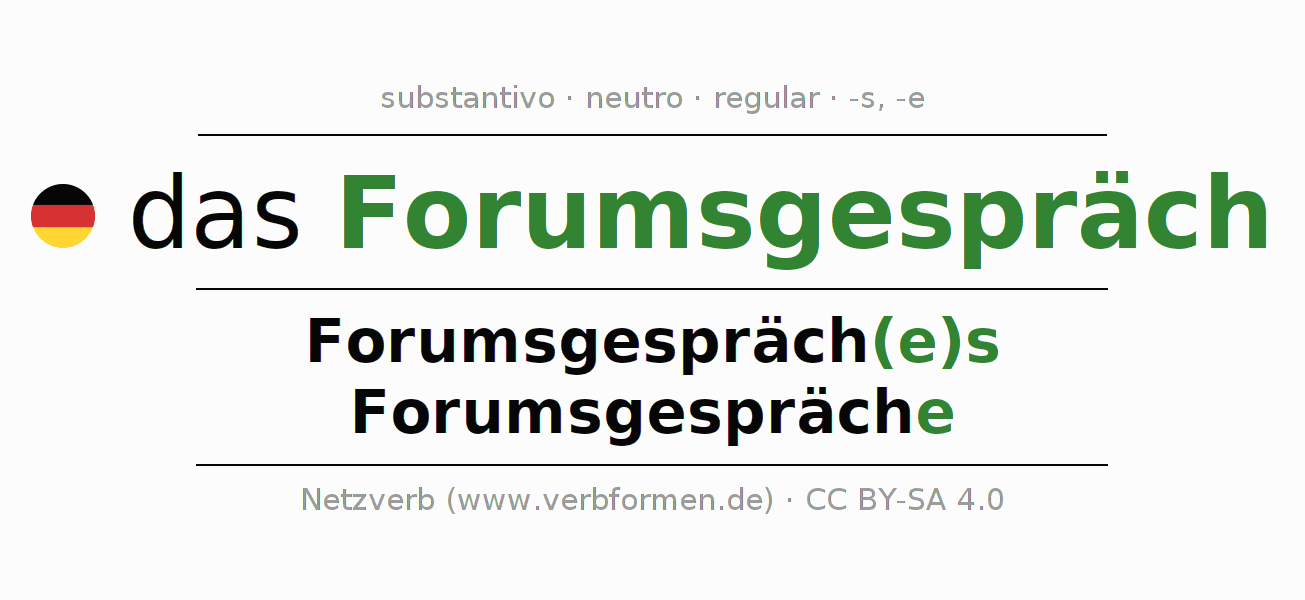 - Plural: die Forumsgespräche, der Forumsgespräche, den Forumsgesprächen, die Forumsgespräche