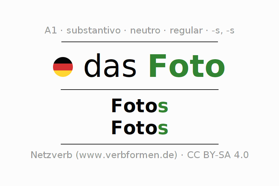 A declinação do substantivo Foto (foto, fotografia) está no genitivo singular Fotos e no nominativo plural Fotos . O substantivo forte Foto é declinado com a terminação s/s. Mas pode também ser usado para outros fins. O gênero gramatical de Foto é neutro e o artigo definido é "das". O substantivo também pode ser usado com outros géneros e outros artigos. Não se pode somente declinar o substantivo Foto mas sim todos os substantivos em alemão. O substantivo faz parte do vocabulário referente ao Certificado em Alemão do Nível A1. Comentários ☆