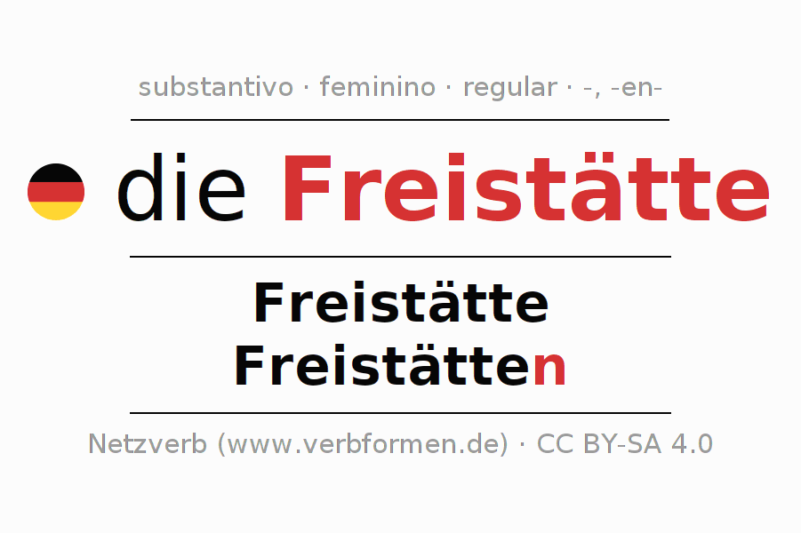 A declinação do substantivo Freistätte (abrigo, refúgio) está no genitivo singular Freistätte e no nominativo plural Freistätten . O substantivo fraco Freistätte é declinado com a terminação -/n. O gênero gramatical de Freistätte é feminino e o artigo definido é "die". Não se pode somente declinar o substantivo Freistätte mas sim todos os substantivos em alemão. Comentários ☆
