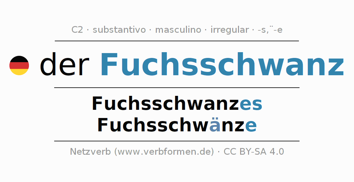 Declinação de Fuchsschwanz é apresentada em uma tabela com todas as formas no singular e no plural (plural) e em todos os quatro casos: nominativo (1º caso), genitivo (2º caso), dativo (3º caso) e acusativo (4º caso) . Especialmente para os alunos de alemão, a correta declinação da palavra Fuchsschwanz é fundamental.