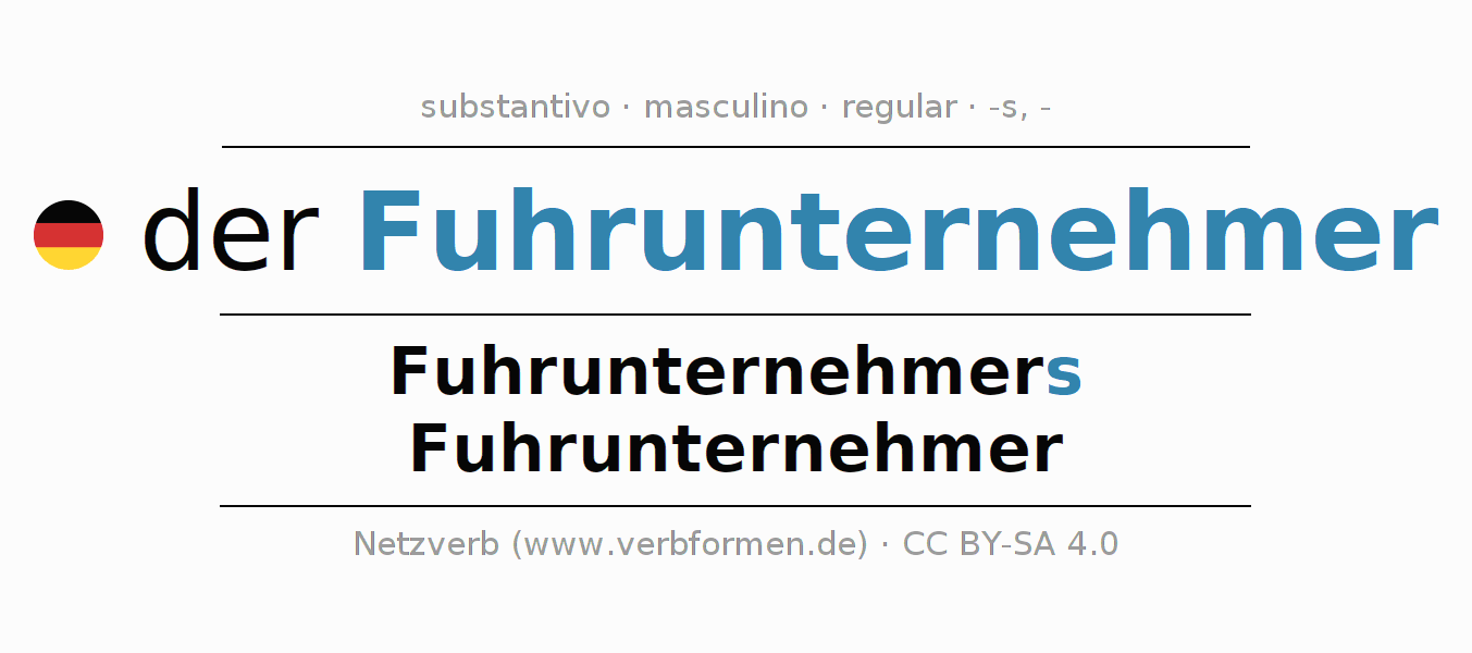 A declinação do substantivo Fuhrunternehmer (empresário de transporte, transportador) está no genitivo singular Fuhrunternehmers e no nominativo plural Fuhrunternehmer . O substantivo forte Fuhrunternehmer é declinado com a terminação s/-. O gênero gramatical de Fuhrunternehmer é masculino e o artigo definido é 'der'. Não se pode somente declinar o substantivo Fuhrunternehmer mas sim todos os substantivos em alemão. Comentários ☆