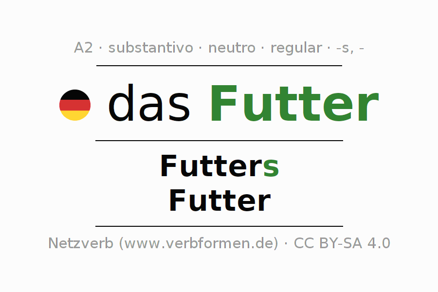 Declinação de Futter é apresentada em uma tabela com todas as formas no singular e no plural (plural) e em todos os quatro casos: nominativo (1º caso), genitivo (2º caso), dativo (3º caso) e acusativo (4º caso) . Especialmente para os alunos de alemão, a correta declinação da palavra Futter é fundamental.