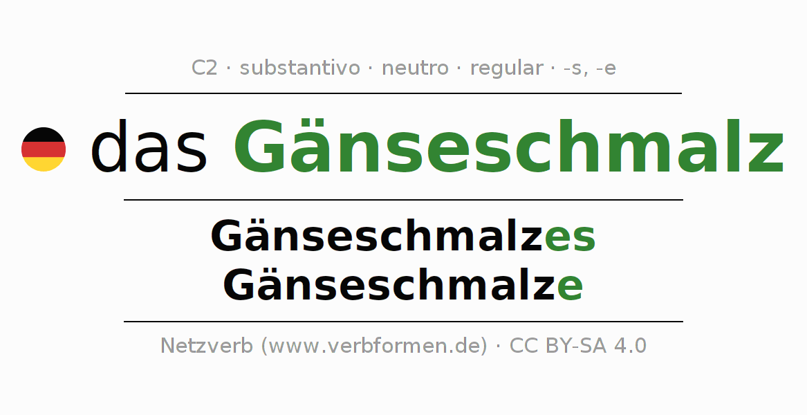 Declinação de Gänseschmalz é apresentada em uma tabela com todas as formas no singular e no plural (plural) e em todos os quatro casos: nominativo (1º caso), genitivo (2º caso), dativo (3º caso) e acusativo (4º caso) . Especialmente para os alunos de alemão, a correta declinação da palavra Gänseschmalz é fundamental.