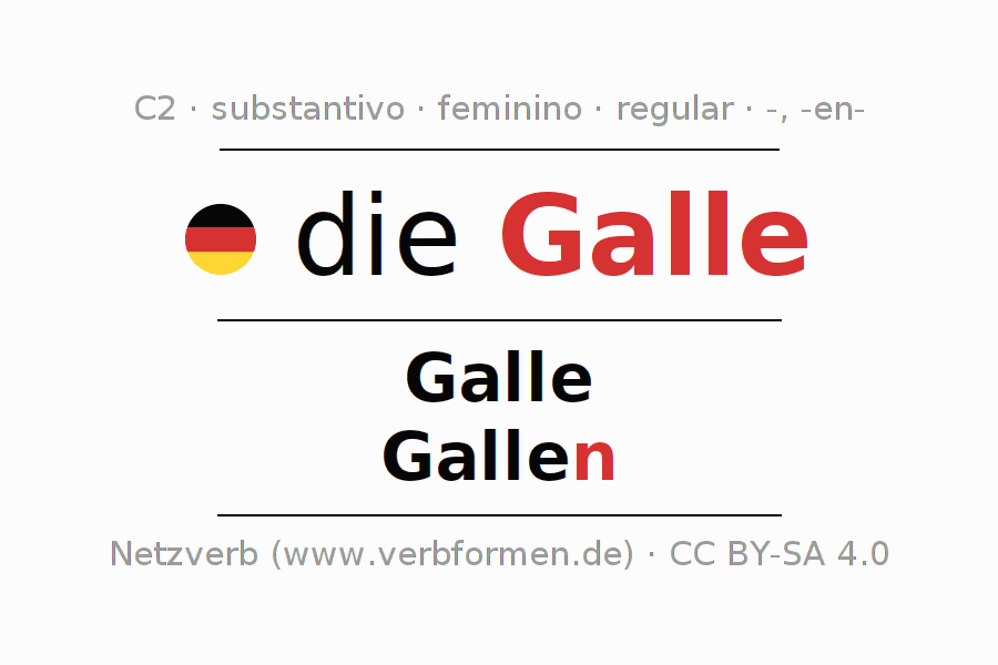 Declinação de Galle é apresentada em uma tabela com todas as formas no singular e no plural (plural) e em todos os quatro casos: nominativo (1º caso), genitivo (2º caso), dativo (3º caso) e acusativo (4º caso) . Especialmente para os alunos de alemão, a correta declinação da palavra Galle é fundamental.