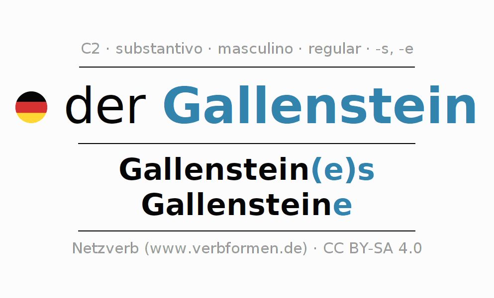 A declinação do substantivo Gallenstein (cálculo biliar, pedra na vesícula) está no genitivo singular Gallenstein(e)s e no nominativo plural Gallensteine . O substantivo forte Gallenstein é declinado com a terminação es/e. O gênero gramatical de Gallenstein é masculino e o artigo definido é 'der'. Não se pode somente declinar o substantivo Gallenstein mas sim todos os substantivos em alemão. O substantivo faz parte do vocabulário referente ao Certificado em Alemão do Nível C2. Comentários ☆