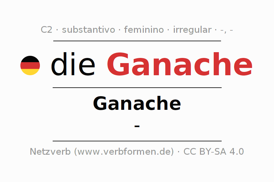 Declinação de Ganache é apresentada em uma tabela com todas as formas no singular e no plural (plural) e em todos os quatro casos: nominativo (1º caso), genitivo (2º caso), dativo (3º caso) e acusativo (4º caso) . Especialmente para os alunos de alemão, a correta declinação da palavra Ganache é fundamental.