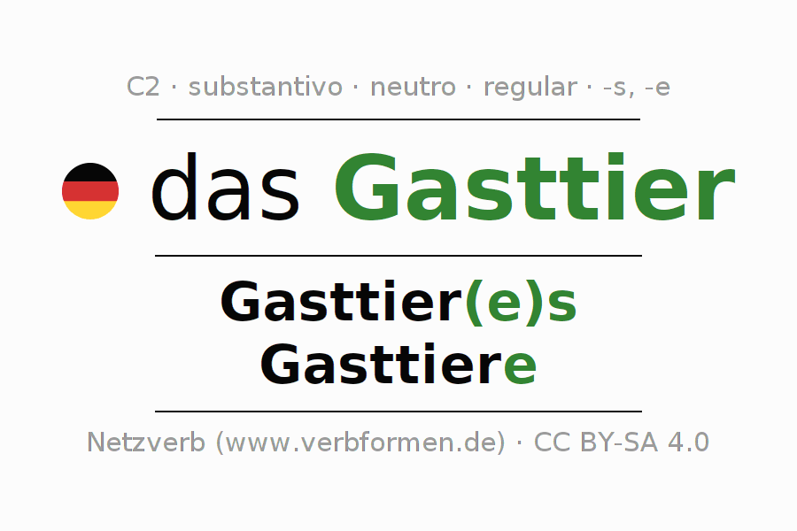 Declinação de Gasttier é apresentada em uma tabela com todas as formas no singular e no plural (plural) e em todos os quatro casos: nominativo (1º caso), genitivo (2º caso), dativo (3º caso) e acusativo (4º caso) . Especialmente para os alunos de alemão, a correta declinação da palavra Gasttier é fundamental.