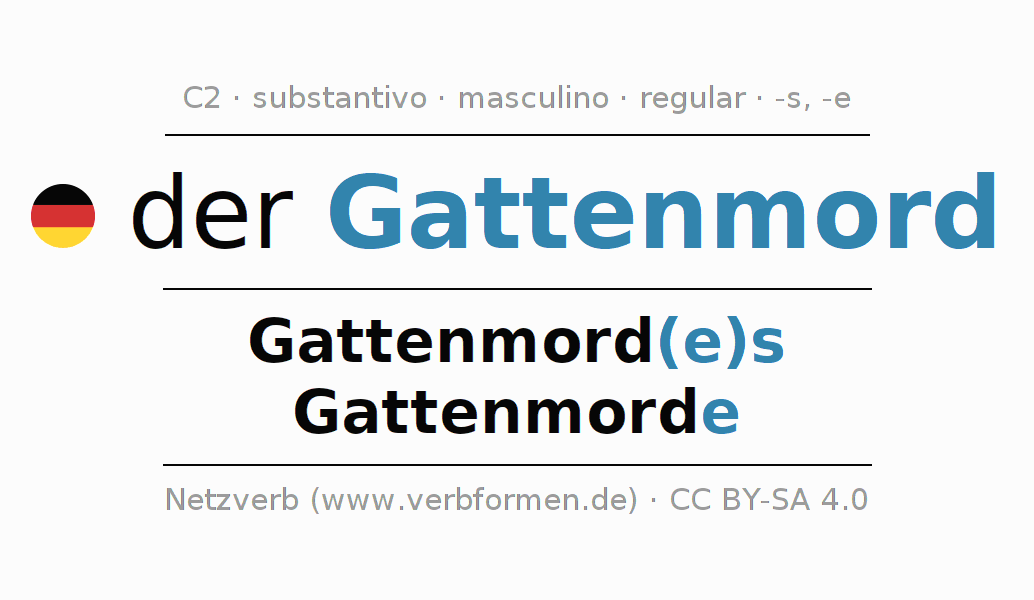 Declinação de Gattenmord é apresentada em uma tabela com todas as formas no singular e no plural (plural) e em todos os quatro casos: nominativo (1º caso), genitivo (2º caso), dativo (3º caso) e acusativo (4º caso) . Especialmente para os alunos de alemão, a correta declinação da palavra Gattenmord é fundamental.