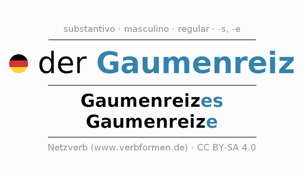 A declinação do substantivo Gaumenreiz (estímulo do paladar) está no genitivo singular Gaumenreizes e no nominativo plural Gaumenreize . O substantivo forte Gaumenreiz é declinado com a terminação es/e. O gênero gramatical de Gaumenreiz é masculino e o artigo definido é 'der'. Não se pode somente declinar o substantivo Gaumenreiz mas sim todos os substantivos em alemão. Comentários ☆