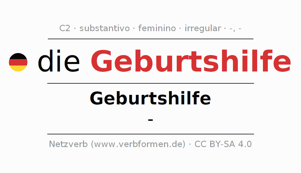 A declinação do substantivo Geburtshilfe (obstetrícia) está no genitivo singular Geburtshilfe e no nominativo plural - . O substantivo Geburtshilfe é declinado com as terminações -/-. Não há formas no plural. O gênero gramatical de Geburtshilfe é feminino e o artigo definido é "die". Não se pode somente declinar o substantivo Geburtshilfe mas sim todos os substantivos em alemão. O substantivo faz parte do vocabulário referente ao Certificado em Alemão do Nível C2. Comentários ☆