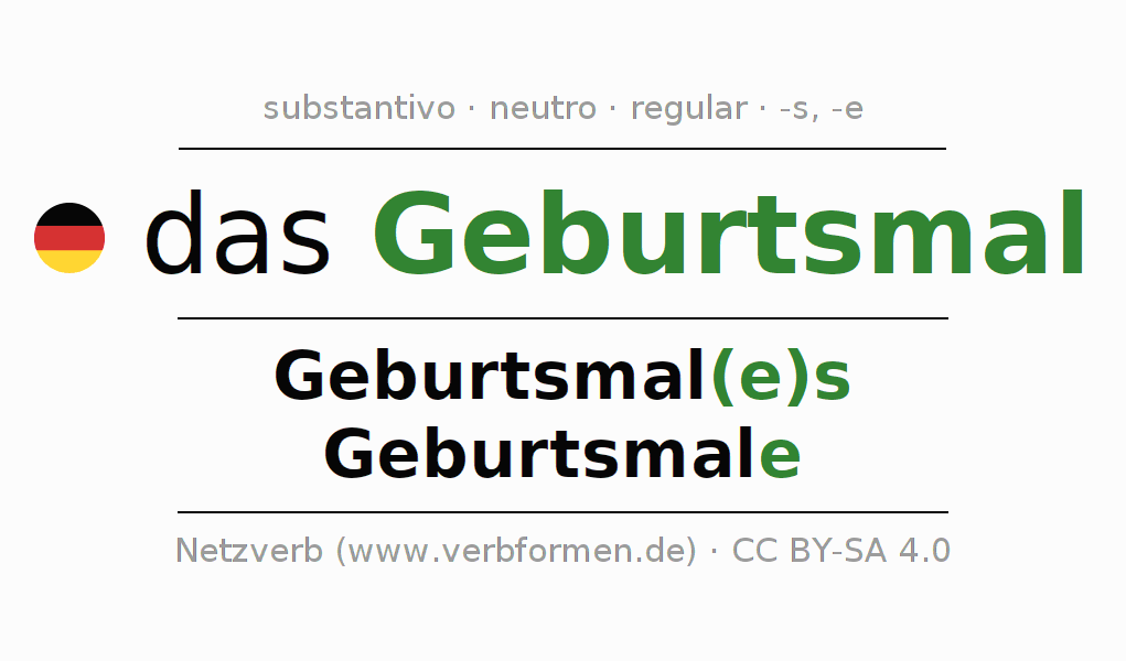 A declinação do substantivo Geburtsmal (marca de nascença, mutação) está no genitivo singular Geburtsmal(e)s e no nominativo plural Geburtsmale . O substantivo forte Geburtsmal é declinado com a terminação es/e. O gênero gramatical de Geburtsmal é neutro e o artigo definido é "das". Não se pode somente declinar o substantivo Geburtsmal mas sim todos os substantivos em alemão. Comentários ☆