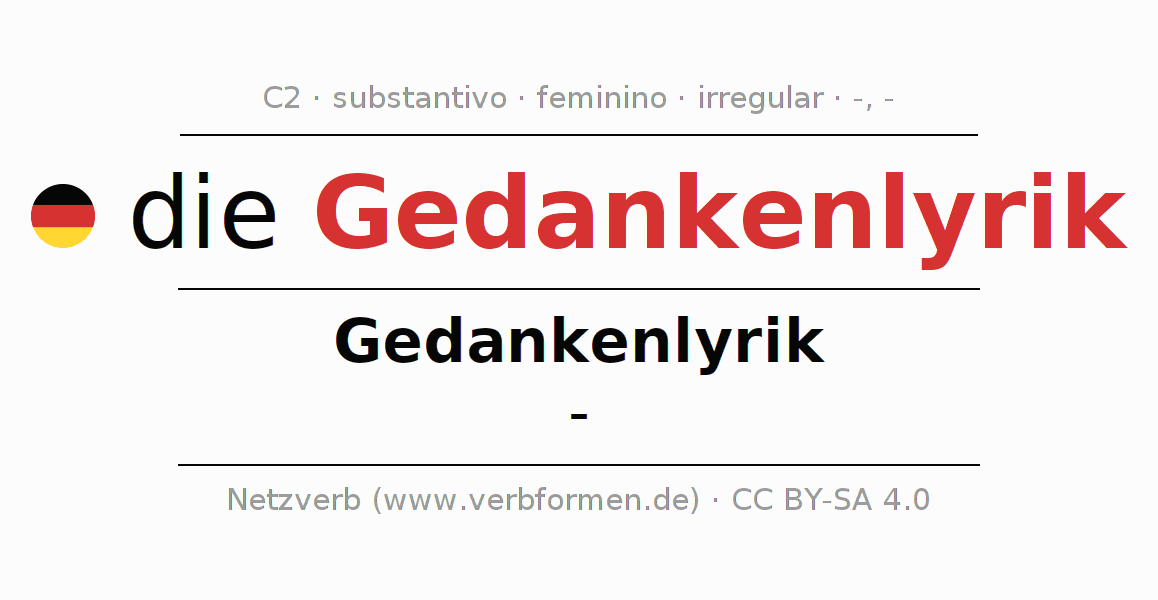 A declinação do substantivo Gedankenlyrik (lyrica reflexiva, poesia reflexiva) está no genitivo singular Gedankenlyrik e no nominativo plural - . O substantivo Gedankenlyrik é declinado com as terminações -/-. Não há formas no plural. O gênero gramatical de Gedankenlyrik é feminino e o artigo definido é "die". Não se pode somente declinar o substantivo Gedankenlyrik mas sim todos os substantivos em alemão. O substantivo faz parte do vocabulário referente ao Certificado em Alemão do Nível C2. Comentários ☆