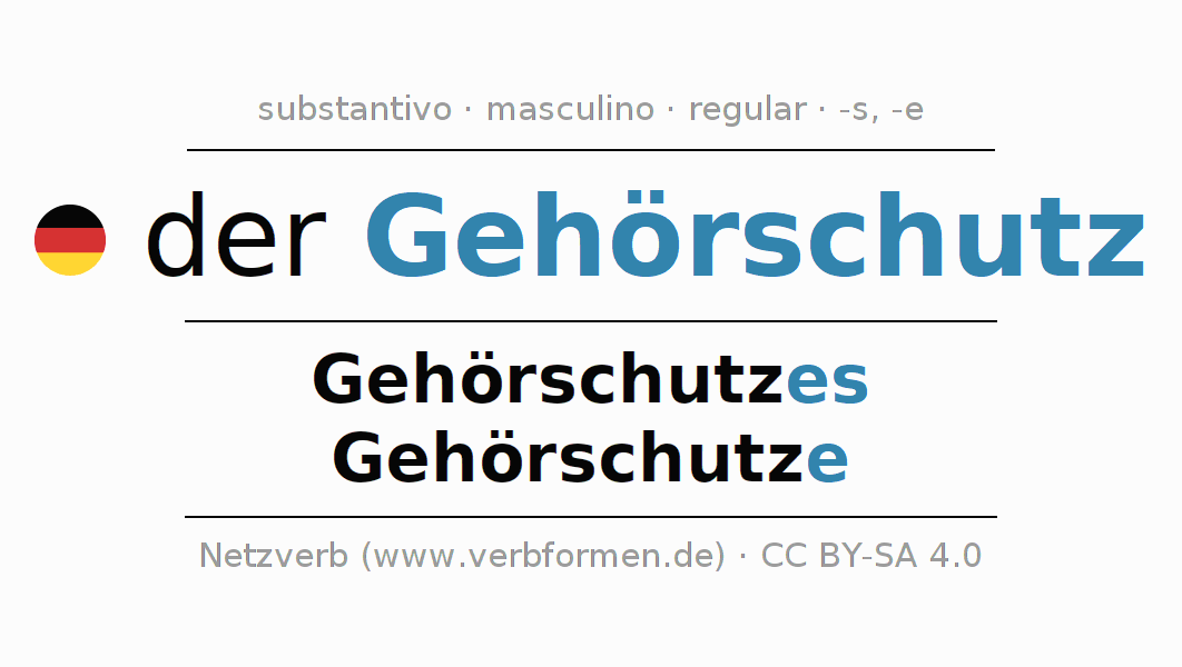 A declinação do substantivo Gehörschutz (protetor auditivo, protetor de ouvido) está no genitivo singular Gehörschutzes e no nominativo plural Gehörschutze . O substantivo forte Gehörschutz é declinado com a terminação es/e. O gênero gramatical de Gehörschutz é masculino e o artigo definido é 'der'. Não se pode somente declinar o substantivo Gehörschutz mas sim todos os substantivos em alemão. Comentários ☆