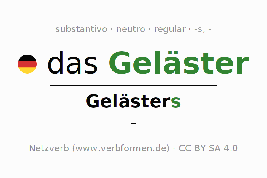 A declinação do substantivo Geläster (calúnia, maldade) está no genitivo singular Gelästers e no nominativo plural - . O substantivo forte Geläster é declinado com a terminação s/-. Não há formas no plural. O gênero gramatical de Geläster é neutro e o artigo definido é "das". Não se pode somente declinar o substantivo Geläster mas sim todos os substantivos em alemão. Comentários ☆