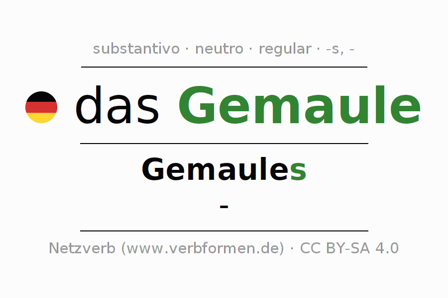 A declinação do substantivo Gemaule está no genitivo singular Gemaules e no nominativo plural - . O substantivo forte Gemaule é declinado com a terminação s/-. Não há formas no plural. O gênero gramatical de Gemaule é neutro e o artigo definido é "das". Não se pode somente declinar o substantivo Gemaule mas sim todos os substantivos em alemão. Comentários ☆