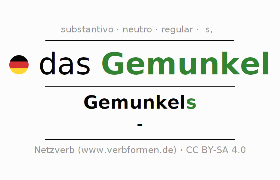 Declinação de Gemunkel é apresentada em uma tabela com todas as formas no singular e no plural (plural) e em todos os quatro casos: nominativo (1º caso), genitivo (2º caso), dativo (3º caso) e acusativo (4º caso) . Especialmente para os alunos de alemão, a correta declinação da palavra Gemunkel é fundamental.