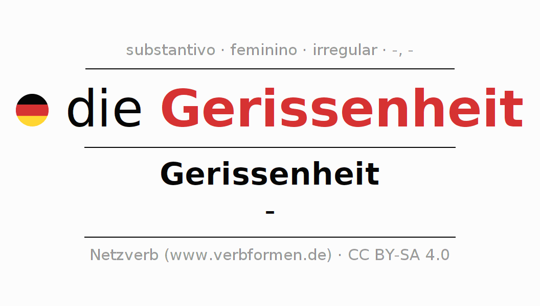 A declinação do substantivo Gerissenheit (astúcia, habilidade) está no genitivo singular Gerissenheit e no nominativo plural - . O substantivo Gerissenheit é declinado com as terminações -/-. Não há formas no plural. O gênero gramatical de Gerissenheit é feminino e o artigo definido é "die". Não se pode somente declinar o substantivo Gerissenheit mas sim todos os substantivos em alemão. Comentários ☆