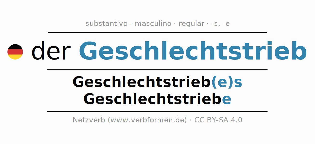 Declinação de Geschlechtstrieb é apresentada em uma tabela com todas as formas no singular e no plural (plural) e em todos os quatro casos: nominativo (1º caso), genitivo (2º caso), dativo (3º caso) e acusativo (4º caso) . Especialmente para os alunos de alemão, a correta declinação da palavra Geschlechtstrieb é fundamental.