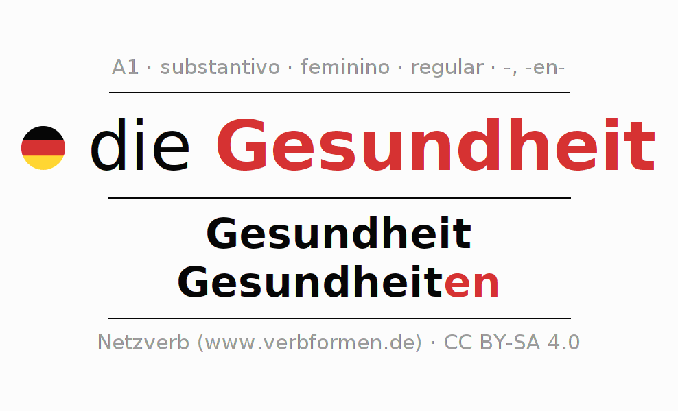 Declinação de Gesundheit é apresentada em uma tabela com todas as formas no singular e no plural (plural) e em todos os quatro casos: nominativo (1º caso), genitivo (2º caso), dativo (3º caso) e acusativo (4º caso) . Especialmente para os alunos de alemão, a correta declinação da palavra Gesundheit é fundamental.