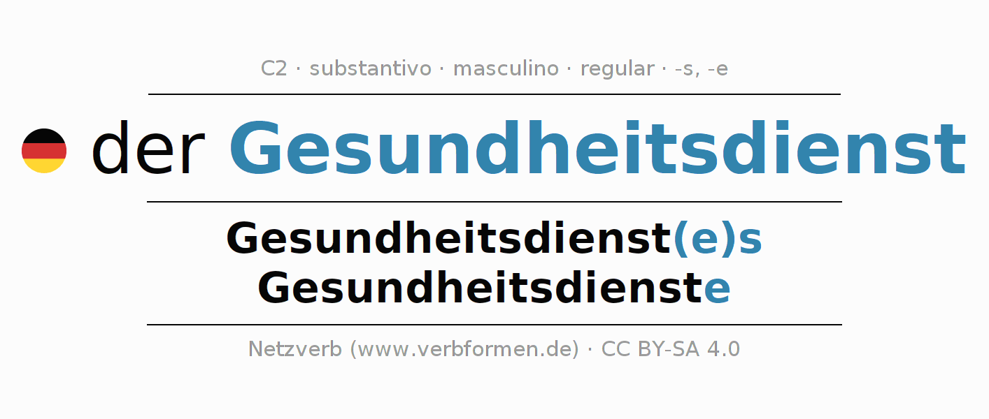 - Singular: der Gesundheitsdienst, des Gesundheitsdienst(e)s, dem Gesundheitsdienst(e), den Gesundheitsdienst