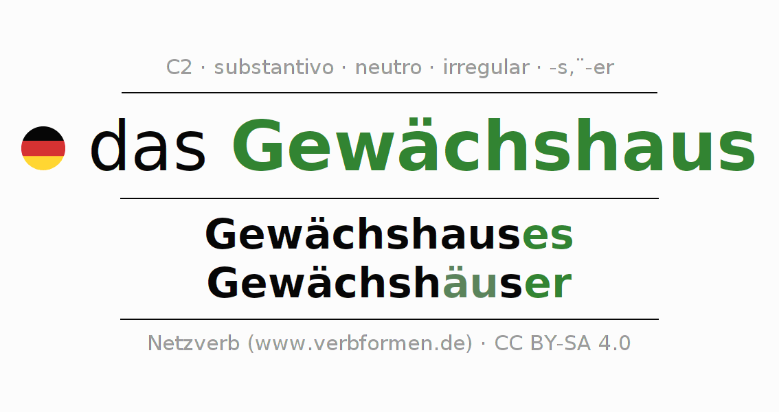 Declinação de Gewächshaus é apresentada em uma tabela com todas as formas no singular e no plural (plural) e em todos os quatro casos: nominativo (1º caso), genitivo (2º caso), dativo (3º caso) e acusativo (4º caso) . Especialmente para os alunos de alemão, a correta declinação da palavra Gewächshaus é fundamental.