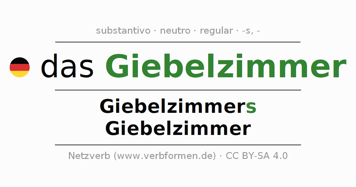 A declinação do substantivo Giebelzimmer (quarto de sótão) está no genitivo singular Giebelzimmers e no nominativo plural Giebelzimmer . O substantivo forte Giebelzimmer é declinado com a terminação s/-. O gênero gramatical de Giebelzimmer é neutro e o artigo definido é "das". Não se pode somente declinar o substantivo Giebelzimmer mas sim todos os substantivos em alemão. Comentários ☆
