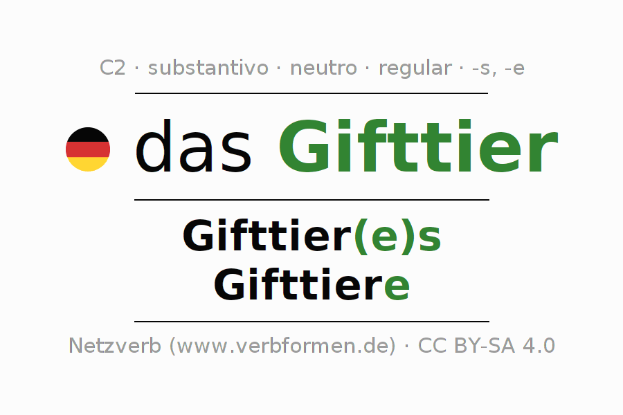 Declinação de Gifttier é apresentada em uma tabela com todas as formas no singular e no plural (plural) e em todos os quatro casos: nominativo (1º caso), genitivo (2º caso), dativo (3º caso) e acusativo (4º caso) . Especialmente para os alunos de alemão, a correta declinação da palavra Gifttier é fundamental.