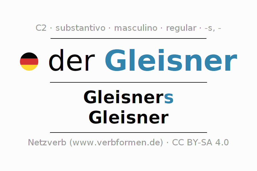 Declinação de Gleisner é apresentada em uma tabela com todas as formas no singular e no plural (plural) e em todos os quatro casos: nominativo (1º caso), genitivo (2º caso), dativo (3º caso) e acusativo (4º caso) . Especialmente para os alunos de alemão, a correta declinação da palavra Gleisner é fundamental.
