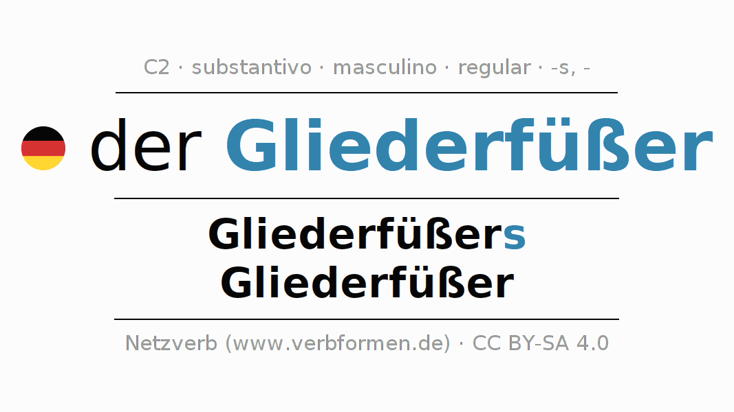 Declinação de Gliederfüßer é apresentada em uma tabela com todas as formas no singular e no plural (plural) e em todos os quatro casos: nominativo (1º caso), genitivo (2º caso), dativo (3º caso) e acusativo (4º caso) . Especialmente para os alunos de alemão, a correta declinação da palavra Gliederfüßer é fundamental.