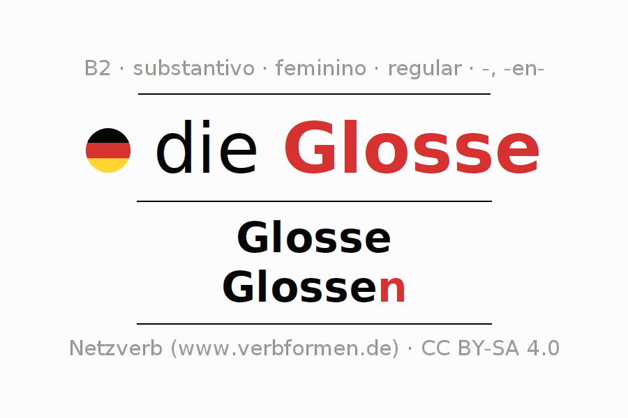 - Plural: die Glossen, der Glossen, den Glossen, die Glossen