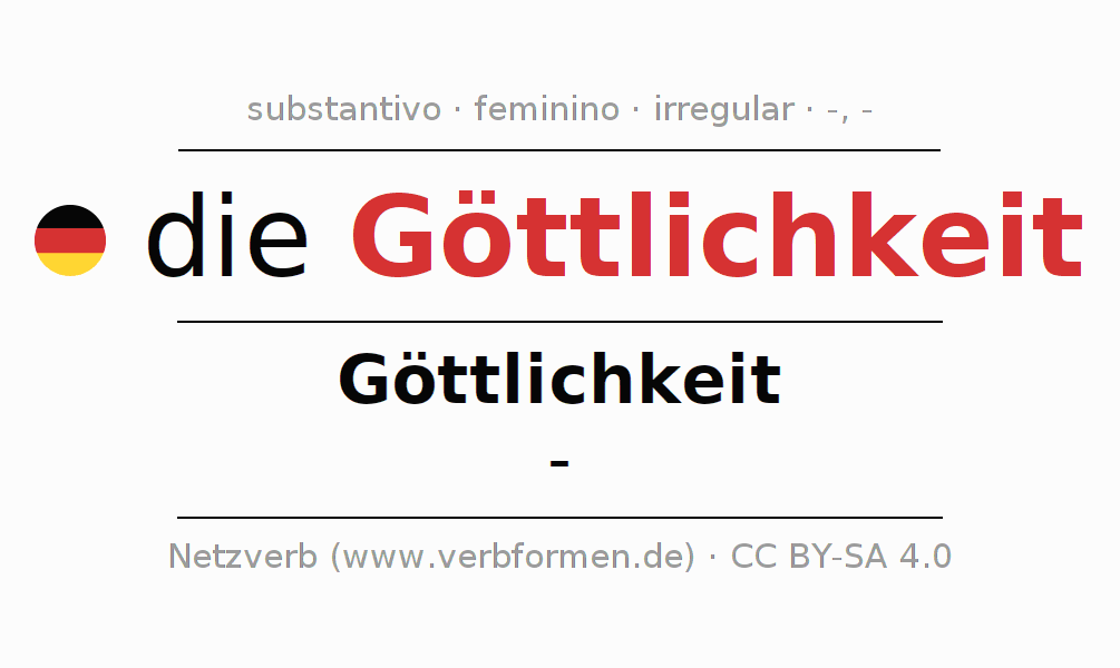 A declinação do substantivo Göttlichkeit (divindade, deidade) está no genitivo singular Göttlichkeit e no nominativo plural - . O substantivo Göttlichkeit é declinado com as terminações -/-. Não há formas no plural. O gênero gramatical de Göttlichkeit é feminino e o artigo definido é "die". Não se pode somente declinar o substantivo Göttlichkeit mas sim todos os substantivos em alemão. Comentários ☆