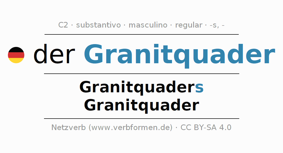 Declinação de Granitquader é apresentada em uma tabela com todas as formas no singular e no plural (plural) e em todos os quatro casos: nominativo (1º caso), genitivo (2º caso), dativo (3º caso) e acusativo (4º caso) . Especialmente para os alunos de alemão, a correta declinação da palavra Granitquader é fundamental.