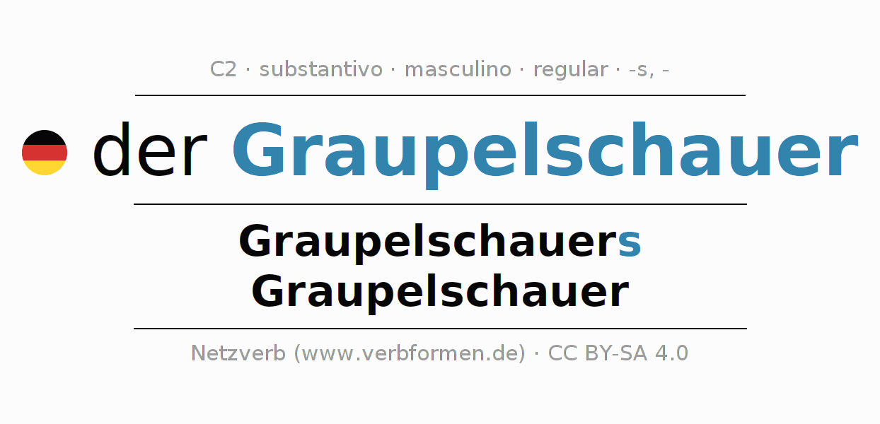 Declinação de Graupelschauer é apresentada em uma tabela com todas as formas no singular e no plural (plural) e em todos os quatro casos: nominativo (1º caso), genitivo (2º caso), dativo (3º caso) e acusativo (4º caso) . Especialmente para os alunos de alemão, a correta declinação da palavra Graupelschauer é fundamental.
